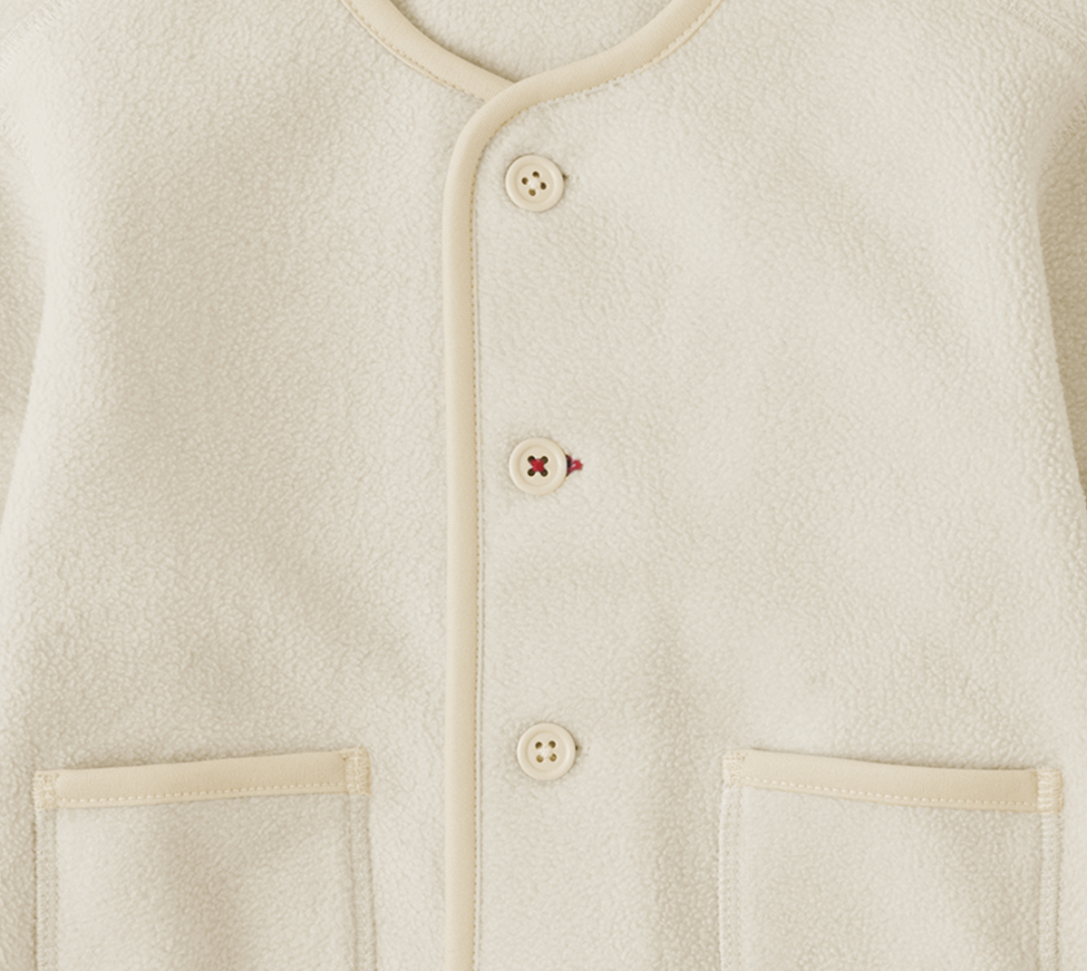 アウター・カーディガン・シャツの「ボタンをきちんと」シリーズは、ボタンの掛け違えを防ぐ工夫として、第二ボタンの留糸とボタンホールステッチやスナップボタンの裏側の色を他のボタンと変えています。ひとりでのお着替えの際に左右を正しく合わせやすく、「きちんと」ボタンを留めることができることで、自分で着る楽しさを育みます。