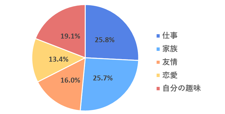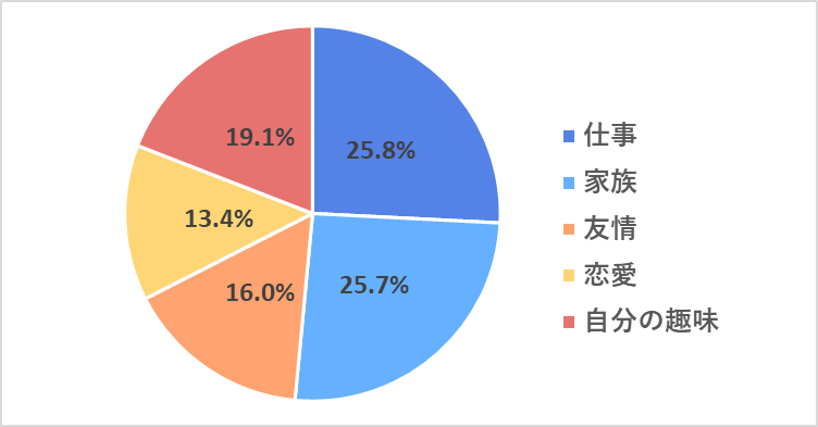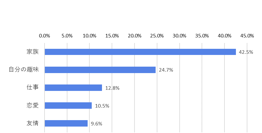 - 社会人人生で、<仕事・家族・友情・恋愛・自分の趣味>のうち、もっとも大事にしたいことは「家族」が42.5%で最多。2位は「自分の趣味」が24.7%となり「仕事」「友情」「恋愛」を上回る【図7、8、9】