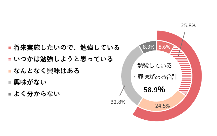資産の増やし方について実施状況や興味関心を聞くと、「投資を実施している」と回答した学生は17.1%だった。また、現在投資を実施してない学生のうち58.9%は興味関心があることが分かった。【図5、6】