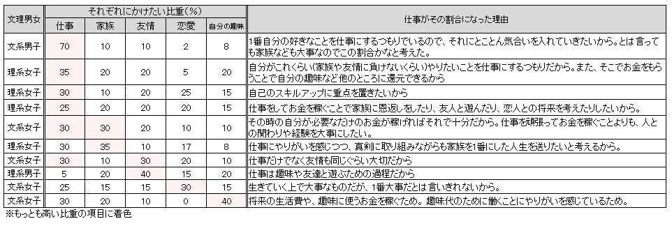 社会人になったあと<仕事・家族・友情・恋愛・自分の趣味>のうち、それぞれどの程度の比重をおきたいか聞いたところ、平均して「仕事」におきたい比重が25.8%でもっとも高く、次いで「家族」が25.7%、「自分の趣味」が19.1%だった。一方、「もっとも大切にしたいもの」を聞くと、最多は「家族」で42.5%、次いで「自分の趣味」が24.7%となり、「仕事」や「友情」、「恋愛」より多かった。学生のコメントを見ると、「家族や友情に負けないくらい(比重をおいて)やりたいことを仕事にするつもり」「趣味代のために働くことにやりがいを感じる」などの意見があった。人生において「仕事」の比重が大きいと考えている学生が多いものの、「もっとも大切にしたいこと」は「家族」や「自分の趣味」であり、仕事はそのための手段として捉えている学生もいると推察される。【図7、8、9】