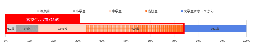 卒業後に就きたい仕事・キャリアの方向性が「決まっている(具体的に+どちらかといえば)」学生は43.0%で前年に比べ0.4pt微増した一方、「全く決まっていない」学生も前年比3.8pt増の25.3%となり2年連続で増加した。「決まっていない」学生が増えた背景としては、コロナ禍での社会情勢の変化などにより、将来像が描きづらかったり、方向性を変えざるを得なかったことが考えられる。方向性が決まっている学生のうち、73.9%は大学入学前に将来のキャリアを意識し始め、特に高校生時が40.4%と最多、次いで大学生が2番目に多く26.1%だった。【図1、2】