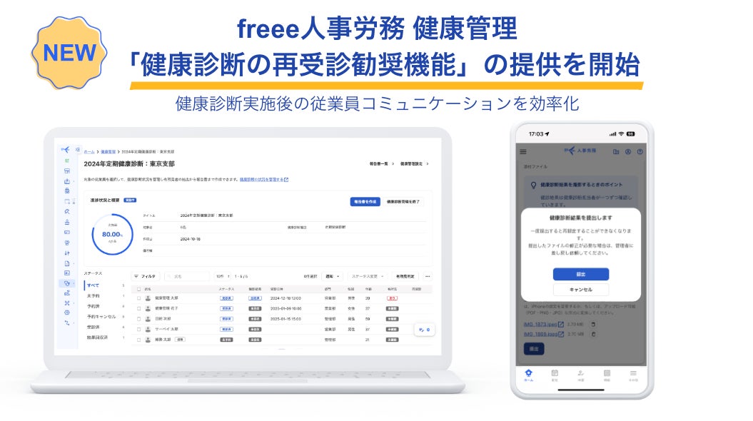 フリー株式会社(本社:東京都品川区、CEO:佐々木大輔、以下「freee」)は、freee人事労務 健康管理において、健康診断の再受診勧奨機能の提供を開始しました。