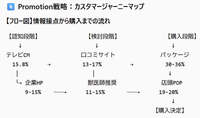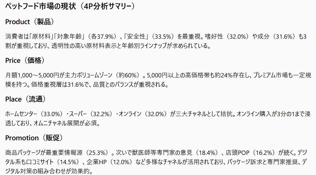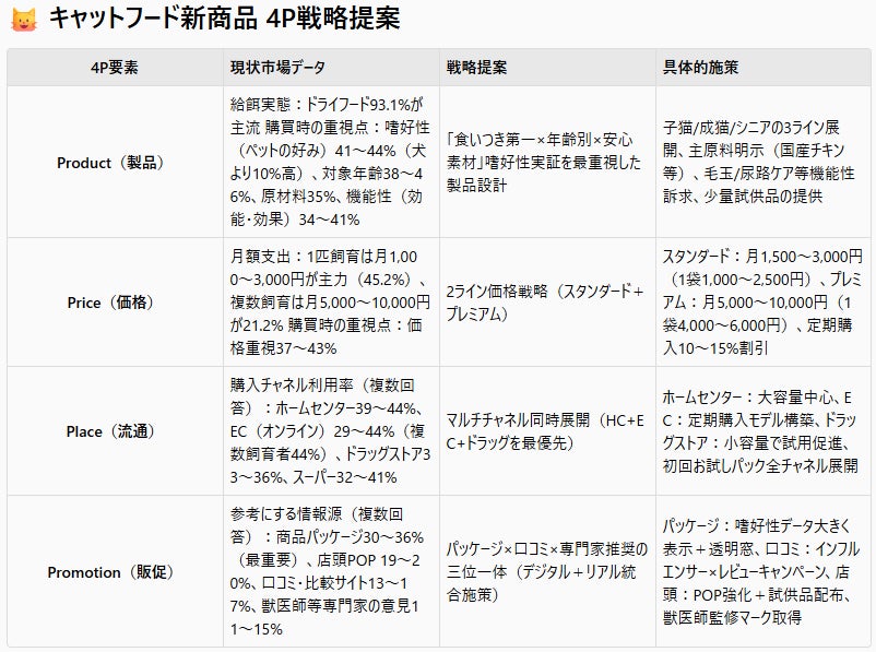 【4P分析・新商品戦略視点】では、キャットフード市場において有効な製品設計・価格帯・流通チャネル・販促施策が明確になりました。