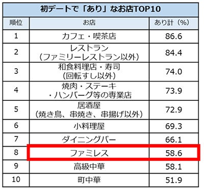 定期的にネット上で議論される「初デートでファミレスはありかなしか」論争。今回の調査では、58.6%(次ページ)の人が「あり」派でした。逆にファストフードは「なし」派が過半数を占め、「あり」「なし」の境界はそのあたりにありそうです。