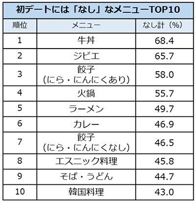 初デートで「あり」なメニューについて調査したところ、1位は「洋食(フレンチ・イタリアン以外)」で87.6%と多くの人が支持する結果になりました。上位には「フレンチ・イタリアン」「パスタ・ピザ」といった西欧料理と、「寿司・海鮮料理・海鮮丼」「天ぷら」といった和食がランクインし、そのほかには「ステーキ・ハンバーグ」「焼き鳥」「焼肉」といった肉料理も票が多く集まりました。一方で「なし」なメニュー1位は「牛丼」(68.4%)。「ラーメン」「カレー」「そば・うどん」など、1人で食べるイメージの強いものが「なし」上位に入りました。また、「ジビエ」「火鍋」「エスニック料理」といった好き嫌いの分かれるものや、「餃子」「韓国料理」などの臭いの強いイメージのあるものも「なし」と判断されやすいようです。