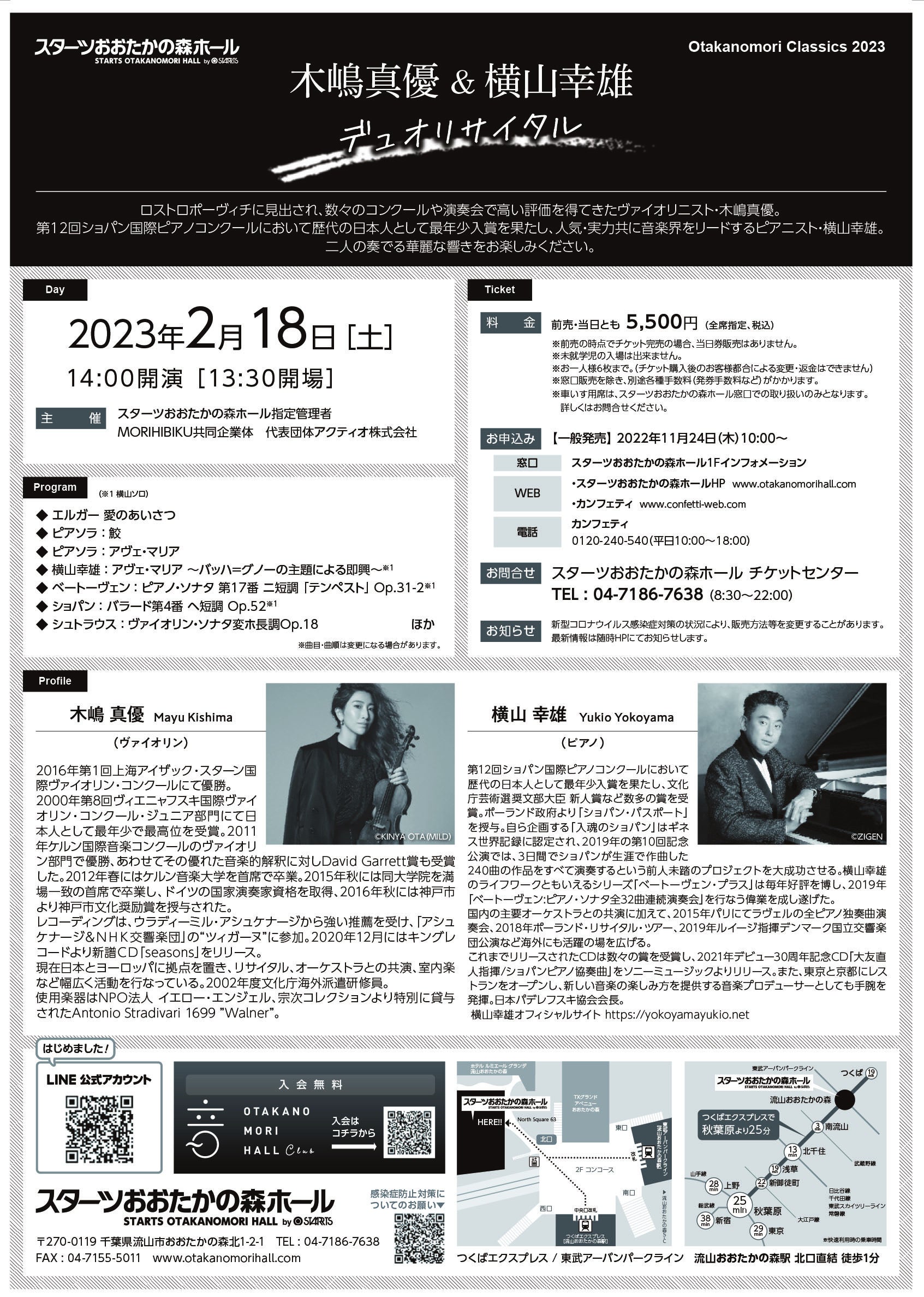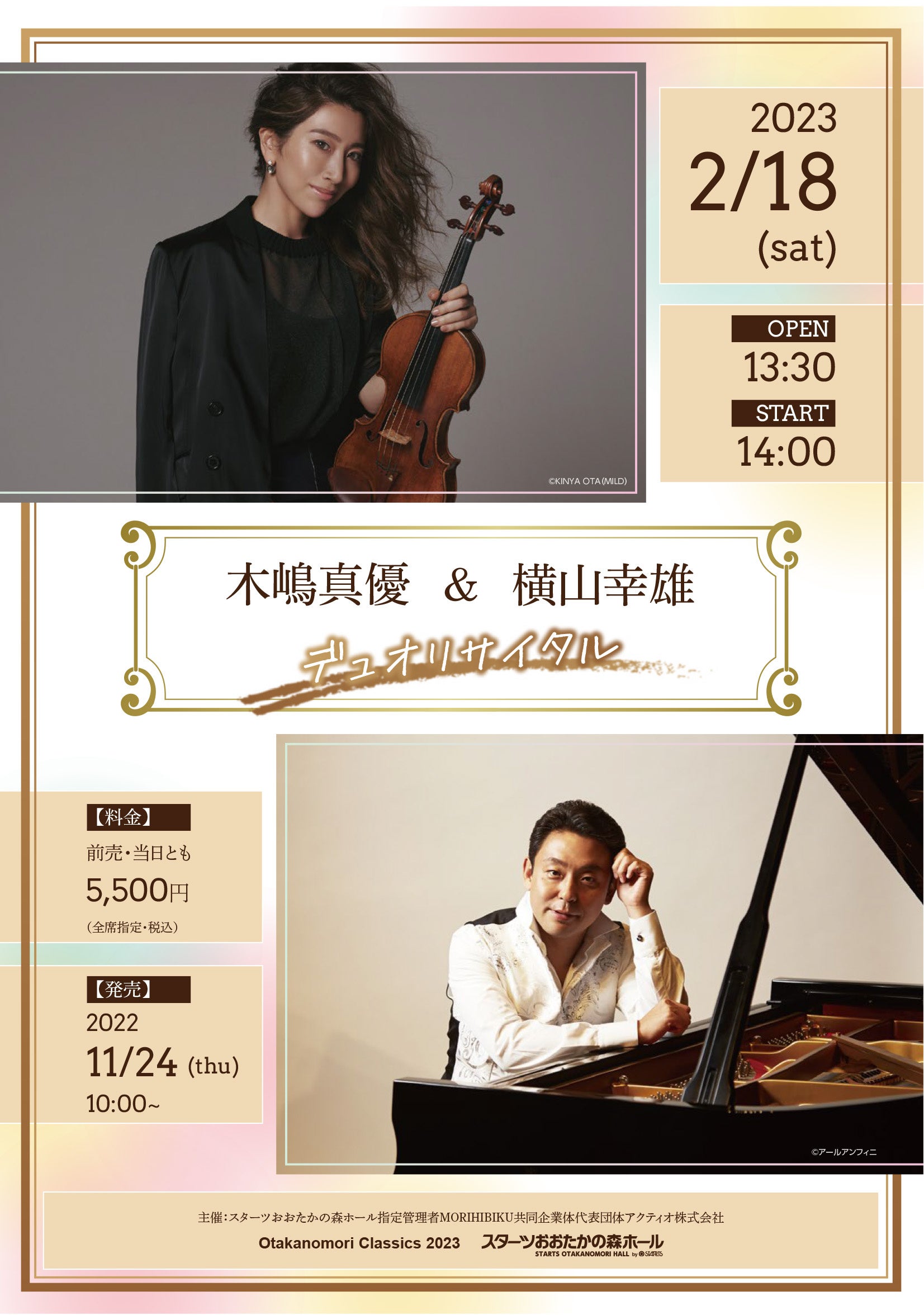 スターツおおたかの森ホール指定管理者MORIHIBIKU共同企業体 代表団体アクティオ株式会社主催、『木嶋真優&横山幸雄 デュオリサイタル』が2023年2月18日 (土)にスターツおおたかの森ホール(千葉県流山市おおたかの森北1-2-1)にて開催されます。チケットはカンフェティ(運営:ロングランプランニング株式会社、東京都新宿区、代表取締役:榑松 大剛)にて11月24日(木)10:00より発売開始です。