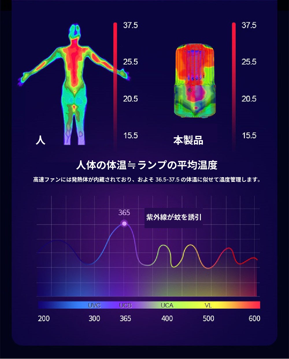 本製品は紫外線と、人間に似せた温度管理、電圧による撃退方法を採用。