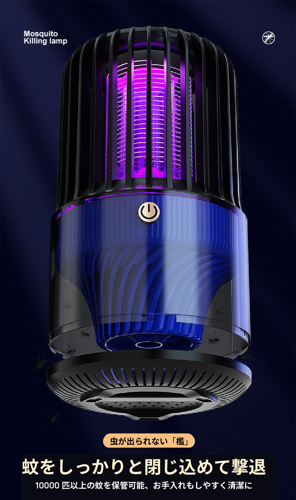 - 3000Vの電圧で誘引した蚊を撃退、蚊を閉じ込めて使用後もお手入れしやすい設計