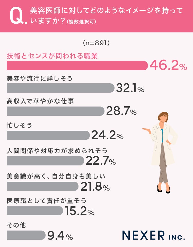 調査の結果、46.2%と半数近くの方が「技術とセンスが問われる職業」と回答し、美容医師の専門性と感性への注目度がうかがえました。