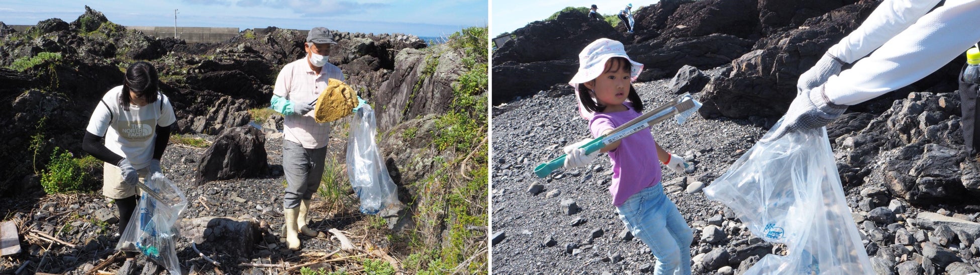 今回の清掃活動には、室戸市や室戸ジオパーク推進委員会のスタッフを含めおよそ40人が参加し、室戸市の新村遊歩道から岩場に下りて、岩の陰や流木にひっかかっているペットボトルや缶、ビン、発泡スチロールを拾い集めました。また、釣具などもあり、参加者を驚かせていました。