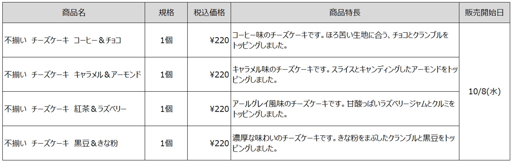 今回は、手軽に食べられるスティックタイプの「不揃い チーズケーキ」を「コーヒー&チョコ」、「キャラメル&アーモンド」、「紅茶&ラズベリー」、「黒豆&きな粉」の4種で発売します。