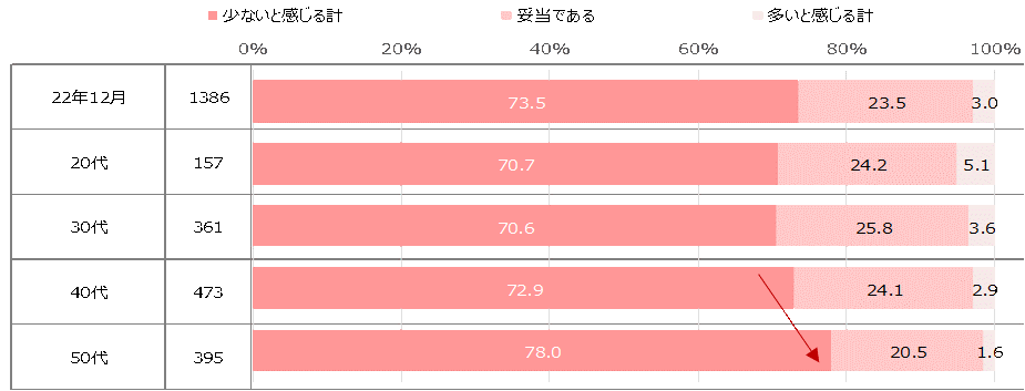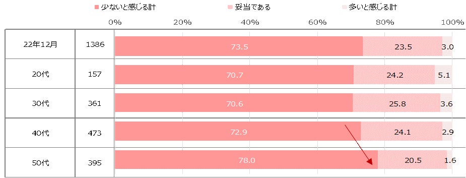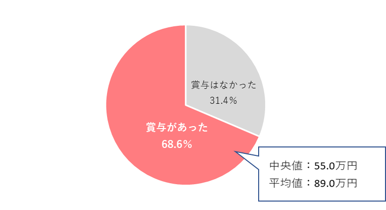 賞与があった正社員は68.6%。賞与額の中央値は55.0万円、平均値は89.0万円となった。賞与額に対する考えをきいたところ、「少ないと感じる」計は73.5%で、50代が最も高くなった。【図6、7】