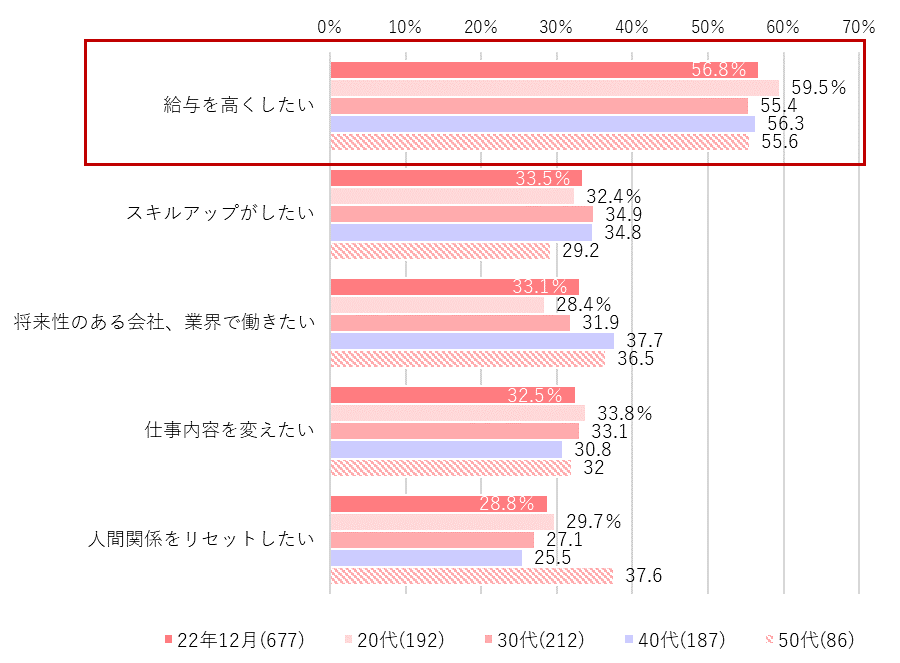 転職活動を実施した理由は、「給与を高くしたい」が56.8%と突出して高く、全世代において給与改善の手段として転職を検討する人が多いようだ。政府による企業への賃上げ要求などもあり、働く人の給与改善ニーズは強い。今後優秀な中途採用人材を確保するために、企業の賃上げ競争が活発化する可能性が考えられる。【図5】