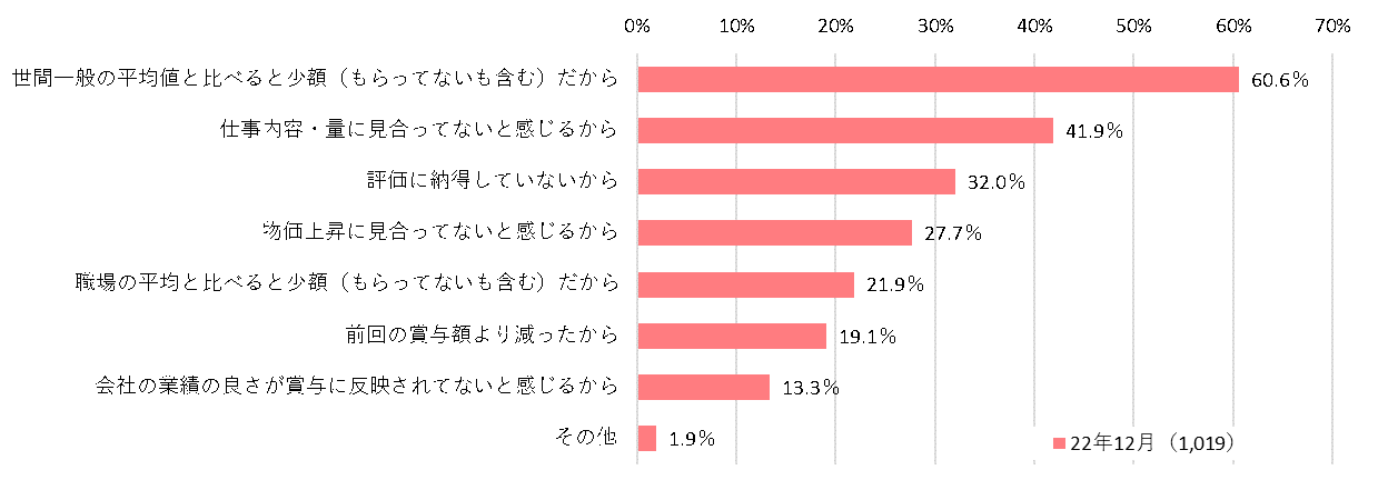 少ないと感じる理由は「世間一般の平均と比べると少額だから」が最も高く60.6%、次いで「仕事内容・量に見合ってないと感じるから」が41.9%となった。【図8】