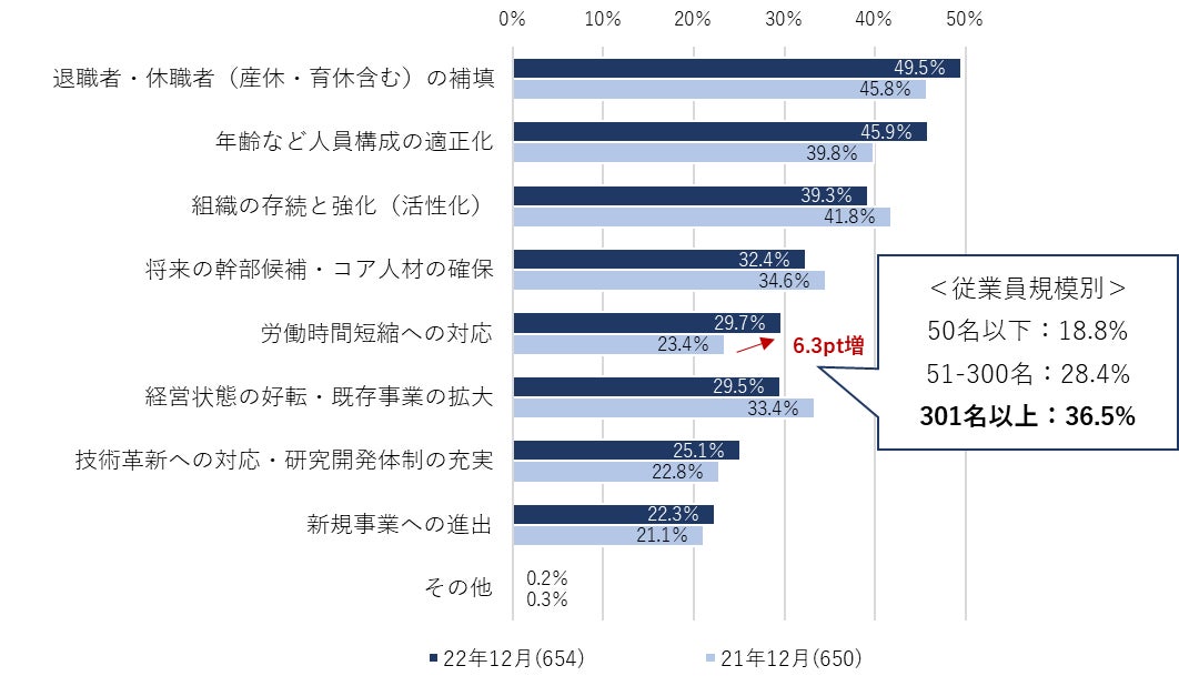 採用理由は「退職者・休職者の補填(産休・育休含む)」が最も多く約5割。前年同月比では「労働時間短縮への対応」が6.3pt増の29.7%となった。特に従業員規模301名以上の企業において、労働時間短縮を目的とした割合は36.5%で全体を上回っており、大企業ほど働き方改革を先行して進めていることから採用活動が活発化したようだ。【図3】
