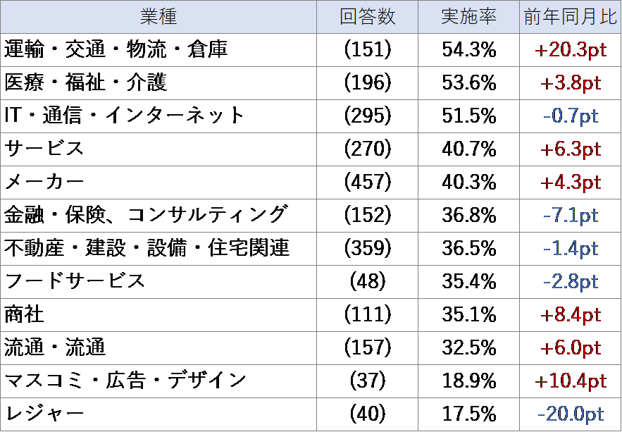 - 企業の中途採用活動は前年同月比3.2pt増の40.5%。特に「労働時間短縮への対応」のために実施する大企業が前年同月比で増加【図1、2、3】