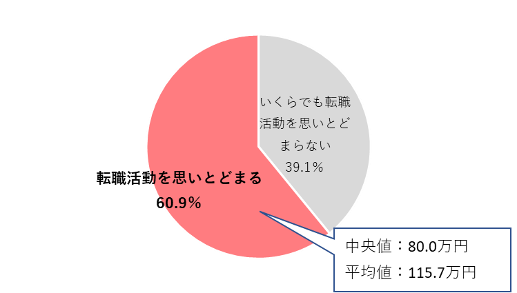 賞与(支給額・タイミング)が転職活動意欲に「影響している」と回答した正社員は64.2%と、賞与額が少ないなどの理由から転職を検討する人が一定数いたことがうかがえる。また、賞与額によって転職を思いとどまるかを聞くと、「思いとどまる」割合は60.9%であった。転職を思いとどまる賞与額を聞くと、中央値は80.0万円、平均値は115.7万円と、実際の賞与額の中央値・平均値と比較して25万円程度の差があった。【図9、10】