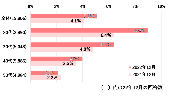 20代~50代の正社員のうち、12月に転職活動を実施した人は5.1%(前年同月比:+1.0pt)。若年層ほど実施率が高く、20代では9.0%となった。【図4】