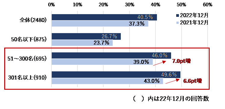 12月に中途採用活動を実施した企業は40.5%で、従業員規模別では「301名以上」で49.6%となった。前年同月比で見ると、全体では3.2pt増、特に「51~300名」企業における実施率の伸びは7.0pt増となった。【図1】