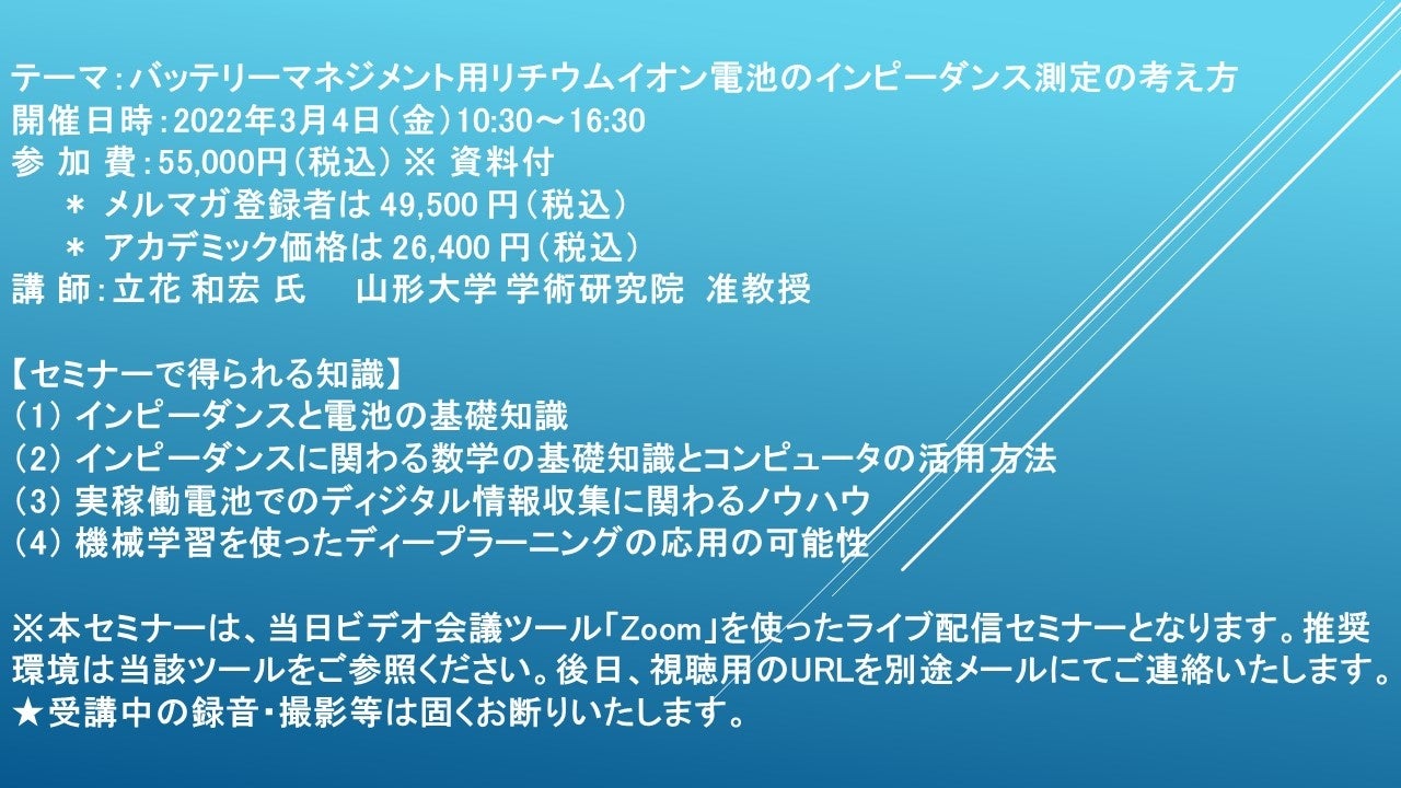 先端技術情報や市場情報を提供している(株)シーエムシー・リサーチ(千代田区神田錦町: https://cmcre.com/ )では、 各種材料・化学品などの市場動向・技術動向のセミナーや書籍発行を行っておりますが、 このたび「バッテリーマネジメント用リチウムイオン電池のインピーダンス測定の考え方」と題するセミナーを、 講師に立花 和宏 氏 山形大学 学術研究院 准教授)をお迎えし、2022年3月4日(金)10:30より、 ZOOMを利用したライブ配信で開催いたします。 受講料は、 一般:55,000円(税込)、 弊社メルマガ会員:49,500 円(税込)、 アカデミック価格は26,400 円(税込)となっております(資料付)。
