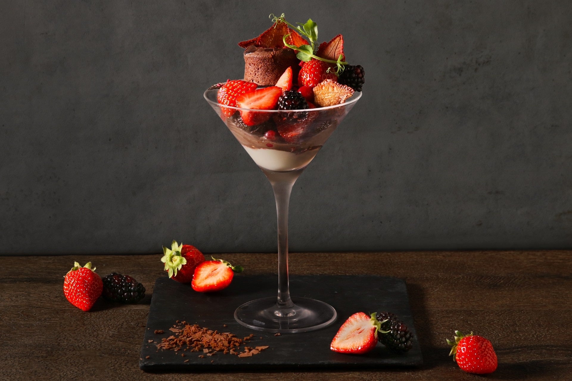 フォンダンショコラを大胆に乗せ苺と合わせた、この時期にぴったりのパフェ。