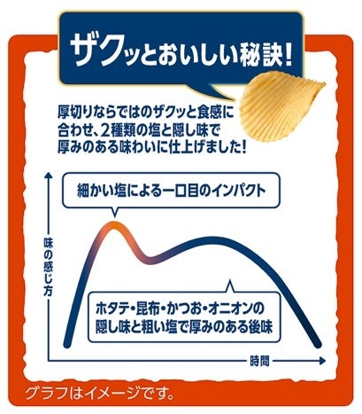 “ザクッ”とした食感が特長のポテトチップスです。厚切りならではの食感に合わせ、2種類の塩と隠し味で厚みのある味わいです。