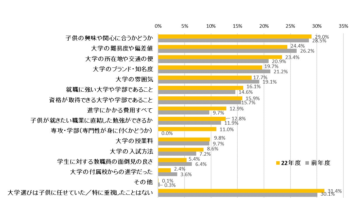 - 子供の大学選びで重視したことは、進学費用など支出関連の項目が前年より増加。教育資金への補助に「大学の授業料の減免」や「所得制限なしの国からの支援」などを求める声も【図3、4】