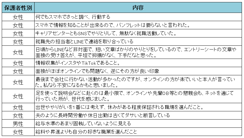 子供の就職活動や日頃のコミュニケーションにおいて「Z世代らしさ」を感じることがあったかを自由回答で聞いたところ、「キャリアセンターともSNSでやりとりして、無駄なく就職活動していた」や「情報収集がインスタやTikTokであること」のように、スマートフォンやSNSを駆使して情報収集している様子が挙げられた。また就職については「出世ややりがいを1番には考えず、休みがある程度保証される職場を選んだこと」や「長時間労働や休日出勤は古くてダサいと断言している」のように、ワークライフバランス重視の特徴がうかがえるコメントも寄せられた。【図6】