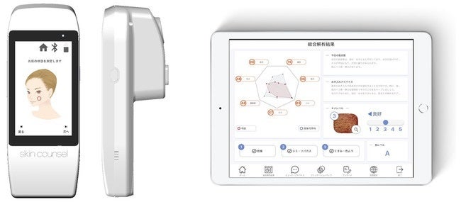コスメデコルテのハンディータイプの肌チェック機器「スキンカウンセルV」をお客さまのお肌にあてると、「水分・油分・ハリ・キメ・透明感・シミ・毛穴」の7項目の結果が表示され、お肌状態を細かく確認できます。