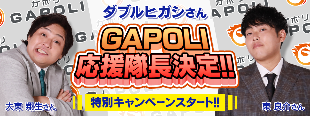 本企画は、ラジオ関西Podcast『はちくちダブルヒガシ』にてダブルヒガシの東さんが番組内でGAPOLIを紹介してくださったことから始まりました。ダブルヒガシのお2人には、今後、応援隊長としてゲーム内外のさまざまな企画でGAPOLIを広める活動を行っていただきます。