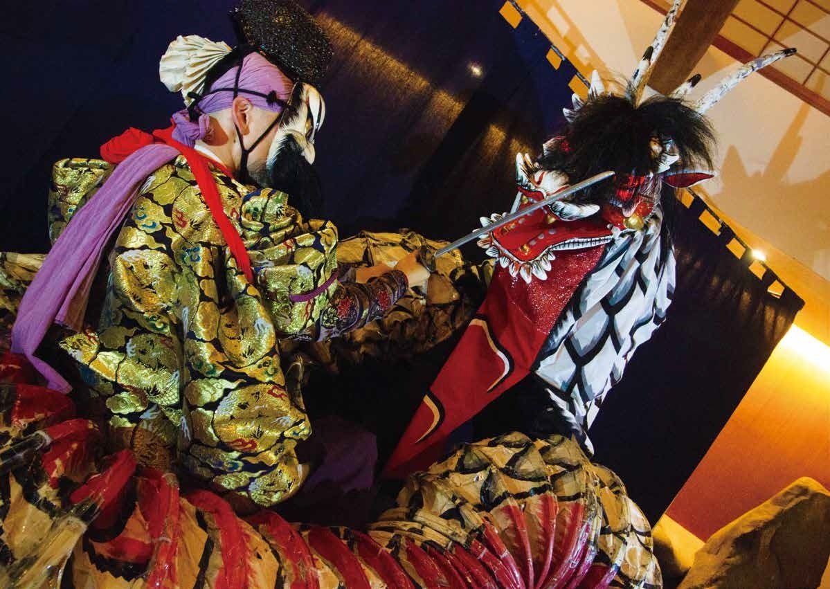 用意した日本酒BARや茶の湯体験ができる茶室があるほか、ロビーでは毎夜、島根の伝統芸能である「石見神楽」が催され、スタッフが軽快な舞を披露してくれます。