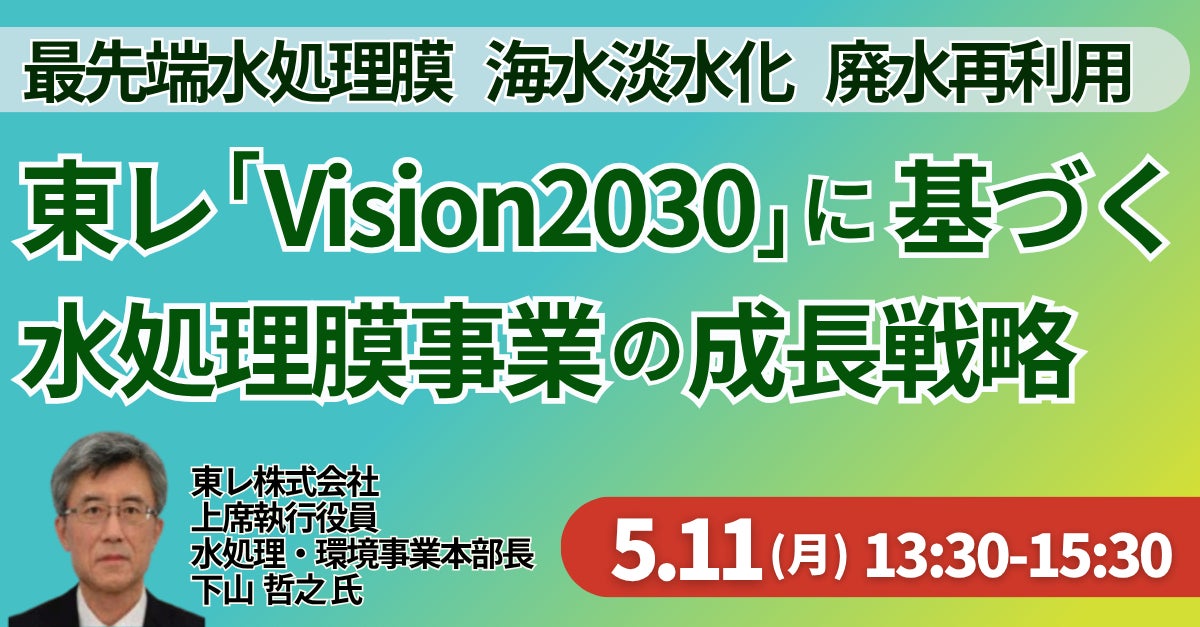 JPI(日本計画研究所)は、東レ株式会社 上席執行役員 水処理・環境事業本部長 下山 哲之 氏を招聘し、「Vision2030」に基づく水処理膜事業の成長戦略と新たな事業機会について詳説いただくセミナーを開催します。