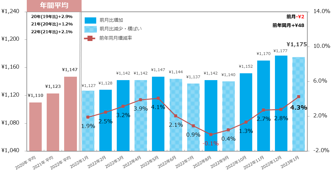- 23年1月の全国平均時給は1,175円で、前年同月比は5カ月連続で増加するも、前月比では4カ月ぶりに微減【図1】