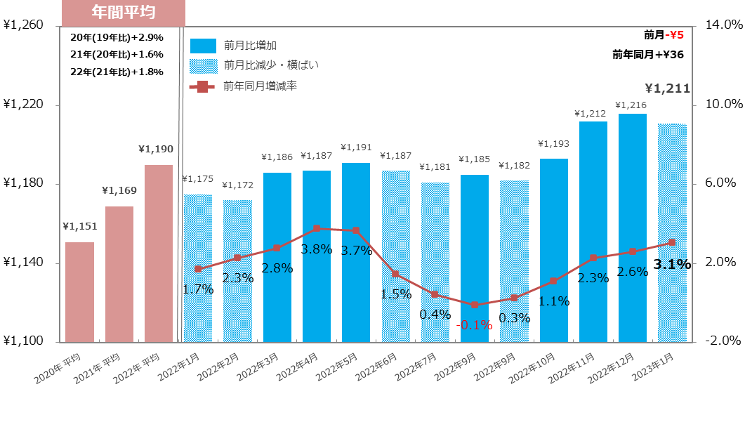 23年1月の全国平均時給は1,175円となり前年同月比は5カ月連続で増加。全エリアで前月比は減少、前年同月比は4カ月連続増。三大都市圏の平均時給は1,211円。