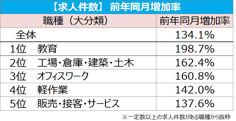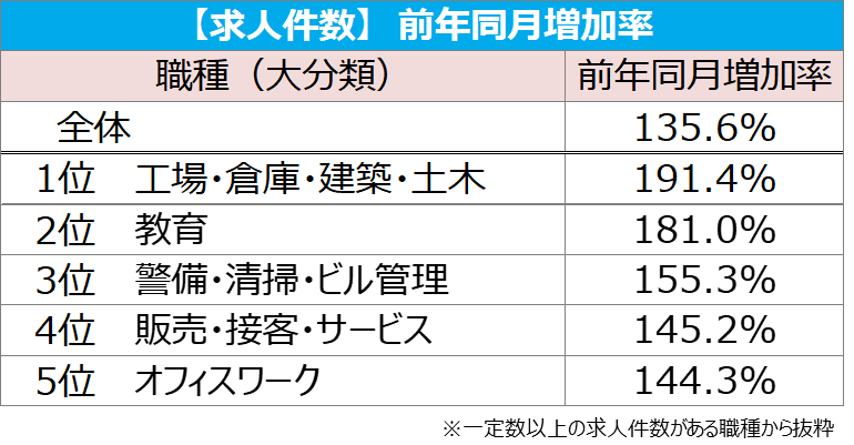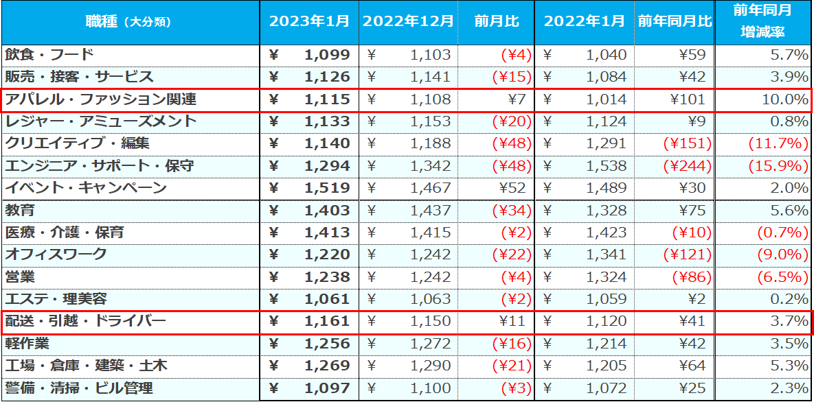 職種(大分類)別では、[アパレル・ファッション関連]が1,115円(前月比:+7円、前年同月比:+101円)、[配送・引越・ドライバー]が1,161円(前月比:+11円、前年同月比:+41円)と、2職種で前月比・前年同月比ともに増加した。また、前年同月比で求人件数が最も増加したのは[工場・倉庫・建築・土木]で1.9倍増となった。