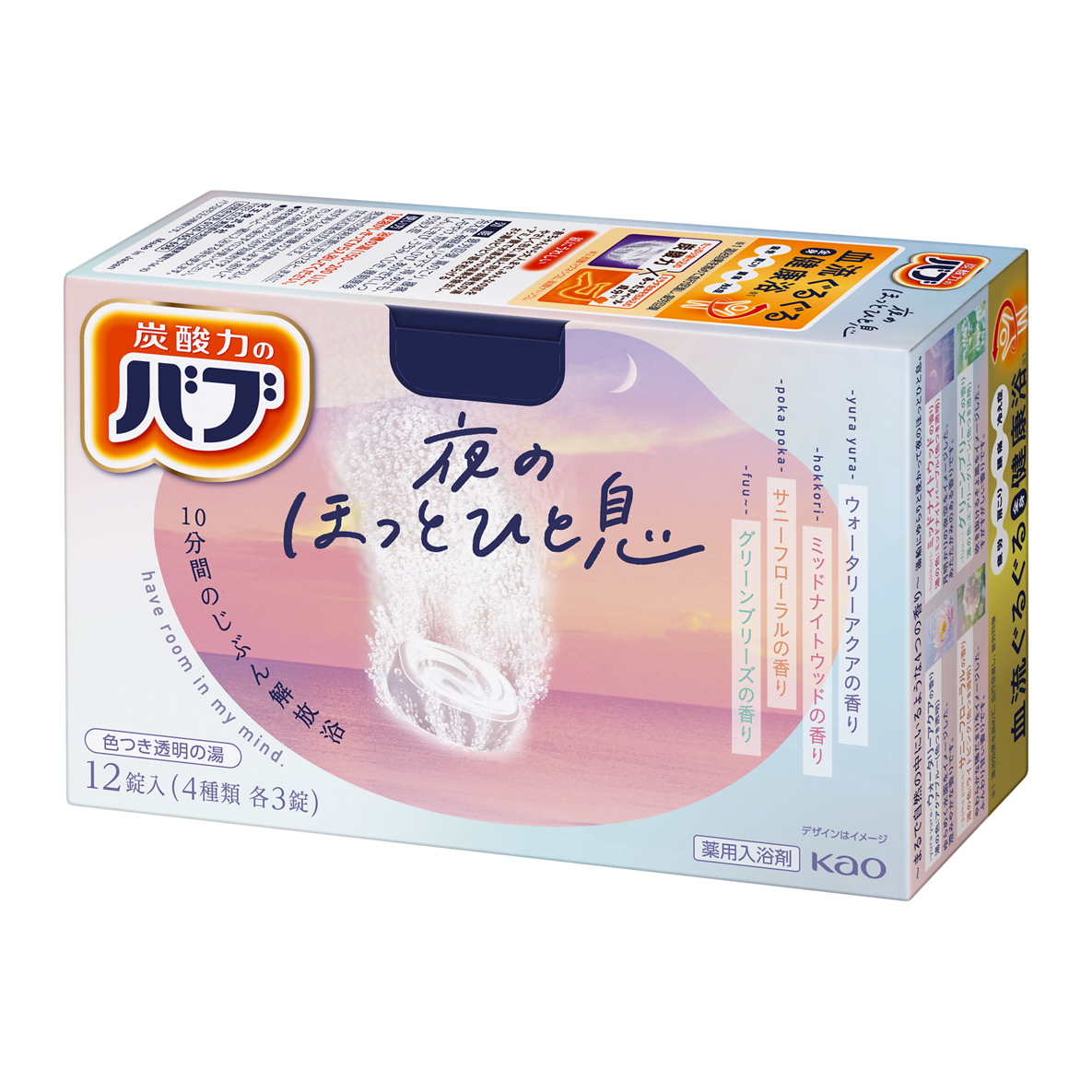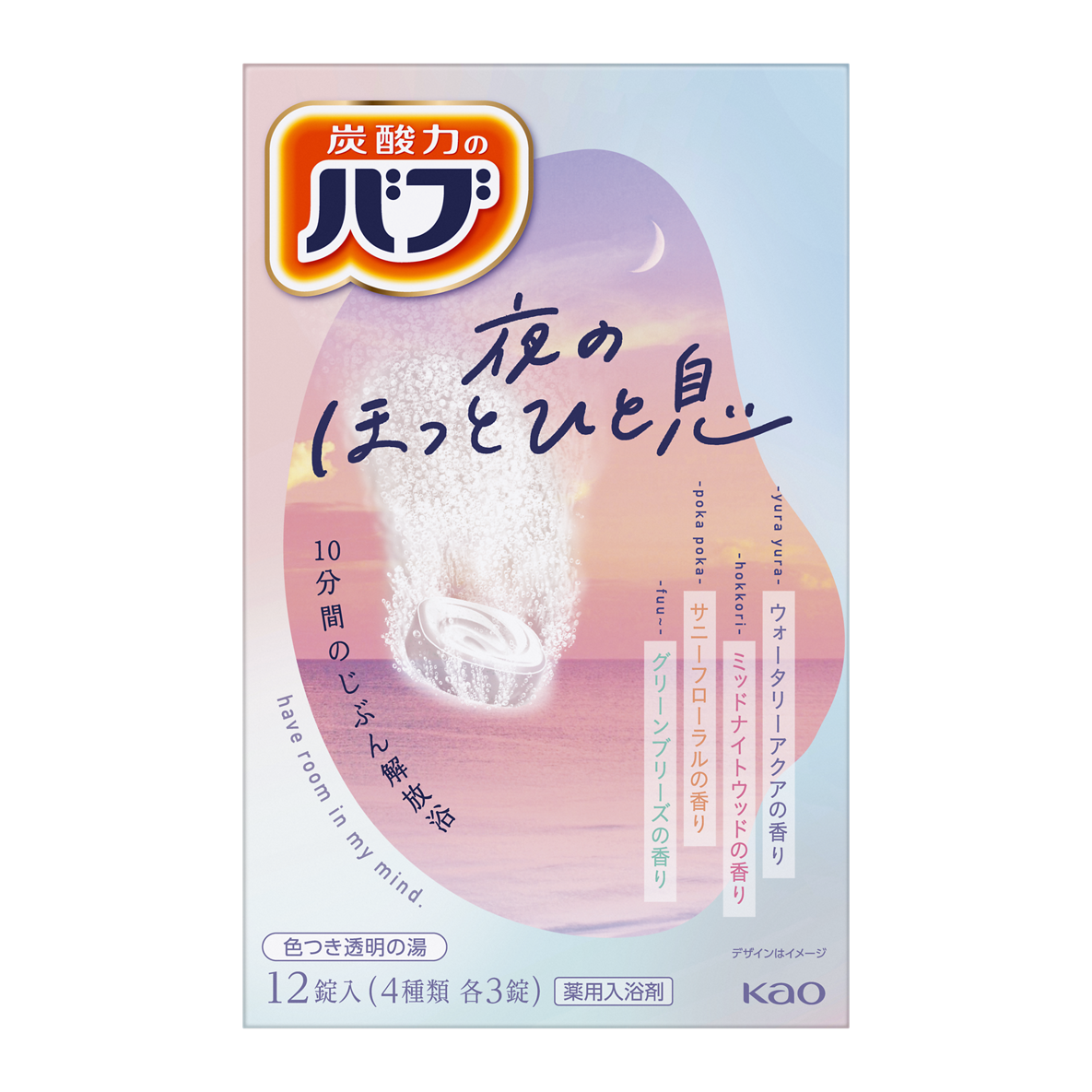 「バブ 夜のほっとひと息」は、忙しい日常生活をおくる方々に向けた商品です。気分を解きほぐす、まるで自然の中にいるような4種類の香りで、湯船にゆらり“10分間のじぶん解放浴”をご提案します。忙しない日常からちょっと離れ、夜のほっとひと息をお楽しみいただけます。
