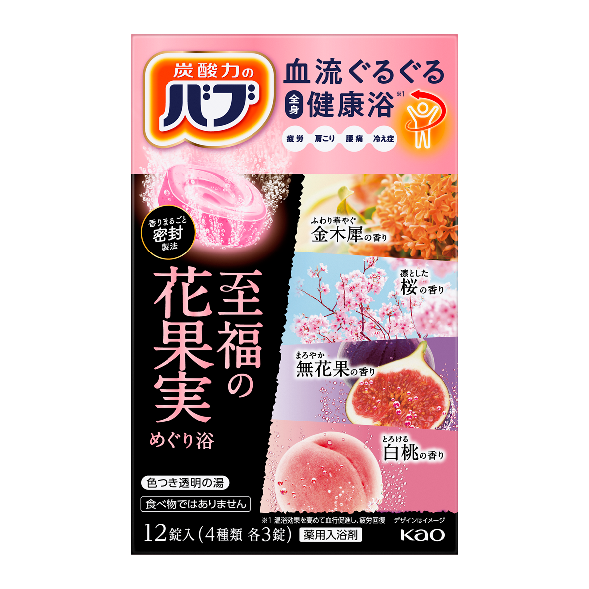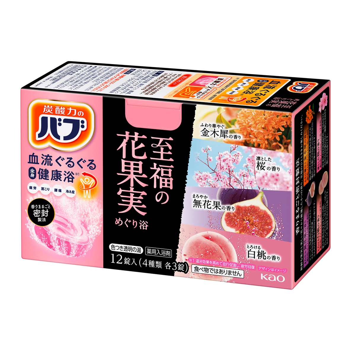 「バブ 至福の花果実めぐり浴」は、既存のアソート品「バブ 至福の花めぐり浴」と「バブ 至福の果実めぐり浴」の人気の香りに、季節を問わず多くの方に好まれている「金木犀(きんもくせい)の香り」を加えた、“香りのいいとこどり”をした商品です。「ふわり華やぐ金木犀の香り」「凛とした桜の香り」「まろやか無花果(いちじく)の香り」「とろける白桃の香り」の美しい花々と新鮮な果実から厳選した4種類の香りを揃えました。さまざまな香りを楽しみたい方におすすめです。