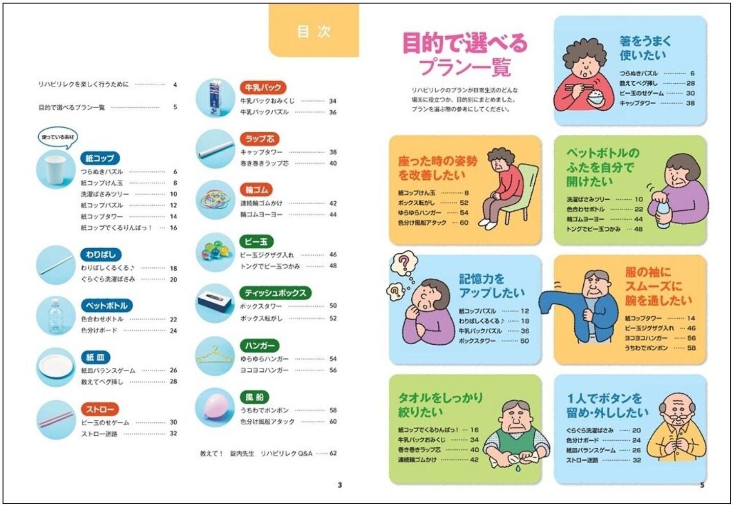 そんな介護・医療現場の声から生まれた、手作りの道具で、楽しみながら効果が期待できるトレーニングをまとめました。リハビリの専門職である作業療法士の監修のもと、今までありそうでなかった、楽しくリハビリを続けるための1冊です。