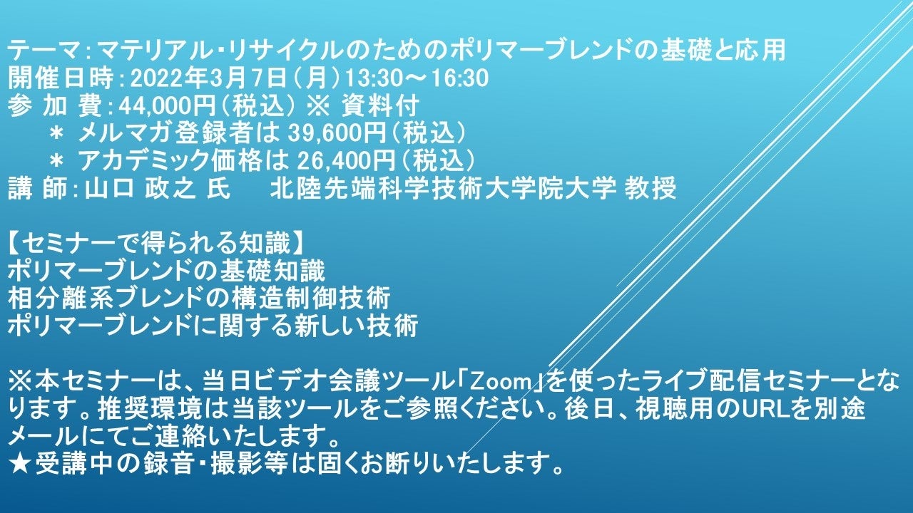先端技術情報や市場情報を提供している(株)シーエムシー・リサーチ(千代田区神田錦町: https://cmcre.com/ )では、 各種材料・化学品などの市場動向・技術動向のセミナーや書籍発行を行っておりますが、 このたび「マテリアル・リサイクルのためのポリマーブレンドの基礎と応用」と題するセミナーを、 講師に山口 政之 氏 北陸先端科学技術大学院大学 教授)をお迎えし、2022年3月7日(月)13:30より、 ZOOMを利用したライブ配信で開催いたします。 受講料は、 一般:44,000円(税込)、 弊社メルマガ会員:39,600円(税込)、 アカデミック価格は26,400円(税込)となっております(資料付)。