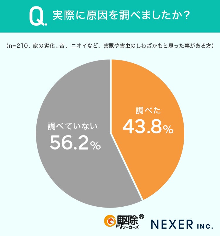 続いて家の劣化、音、ニオイなど、害獣や害虫のしわざかもと思った事が「ある」と回答した方に、実際に原因を調べたか聞いてみました。