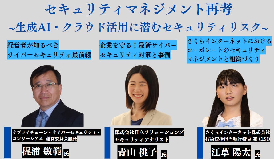 特別講演では、日立ソリューションズのセキュリティアナリスト・青山桃子氏が生成AIやランサムウエアの悪用事例などを解説し、さくらインターネットの最高情報セキュリティ責任者・江草陽太氏は自社の組織づくりなどを紹介します。
