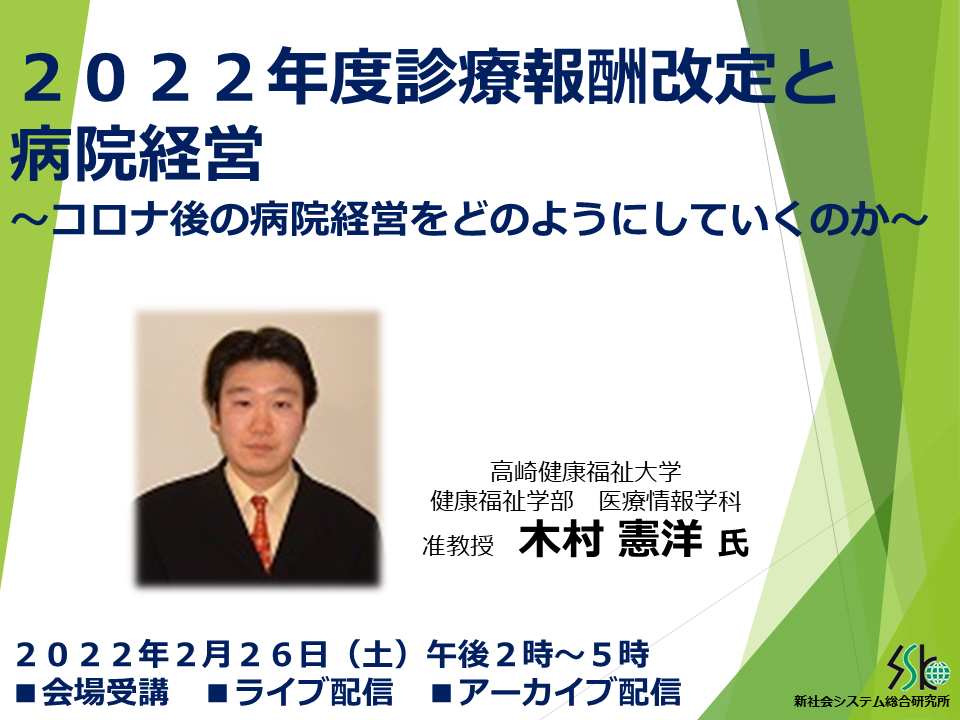 「2022年度診療報酬改定と病院経営」と題して、高崎健康福祉大学 健康福祉学部 医療情報学科 准教授 木村 憲洋氏のセミナーを2022年 2月26日(土)SSKセミナールームにて開催!!