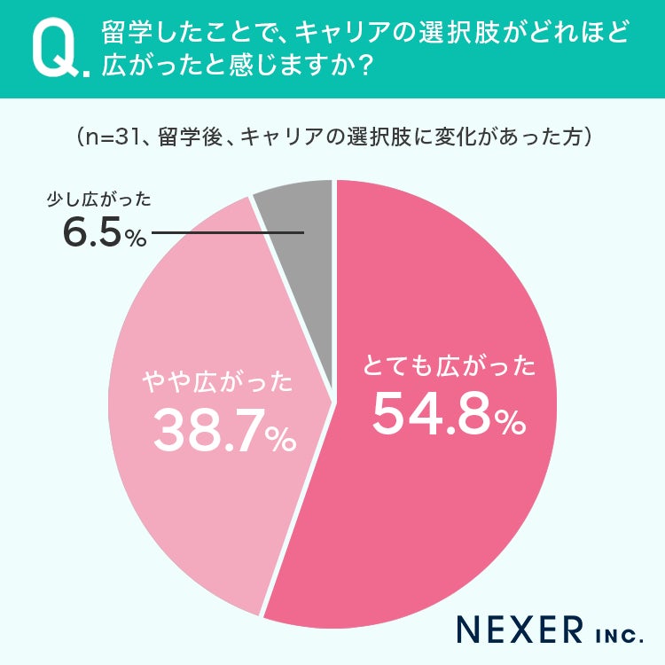 54.8%の方が留学したことで、キャリアの選択肢が「とても広がった」と回答しています。