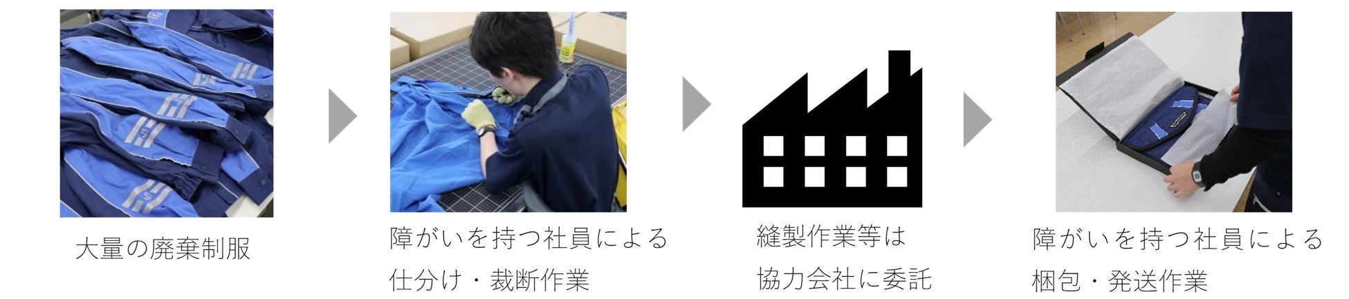 あいウィルでは、制服の裁断を通じてアップサイクル製品の原料を提供してまいりましたが、このたび、障がいのある社員と共に商品の企画開発などを行う新たなプロジェクトを 開始しました。これにより、障がいのある社員が活躍できるフィールドの拡大を実現して まいります。