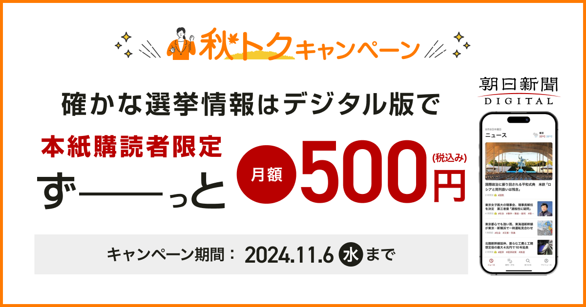 キャンペーン・ダブルコース:本紙購読料+500円(月額・税込み)で朝日新聞デジタルがご利用いただけます。※ご契約は6カ月単位の自動更新です。