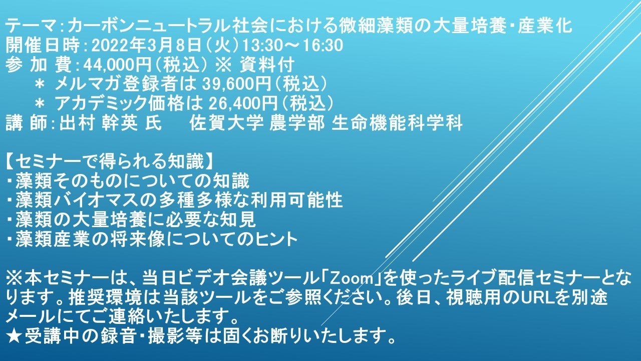 先端技術情報や市場情報を提供している(株)シーエムシー・リサーチ(千代田区神田錦町: https://cmcre.com/ )では、 各種材料・化学品などの市場動向・技術動向のセミナーや書籍発行を行っておりますが、 このたび「カーボンニュートラル社会における微細藻類の大量培養・産業化」と題するセミナーを、 講師に出村 幹英 氏 佐賀大学 農学部 生命機能科学科)をお迎えし、2022年3月8日(火)13:30より、 ZOOMを利用したライブ配信で開催いたします。 受講料は、 一般:44,000円(税込)、 弊社メルマガ会員:39,600円(税込)、 アカデミック価格は26,400円(税込)となっております(資料付)。