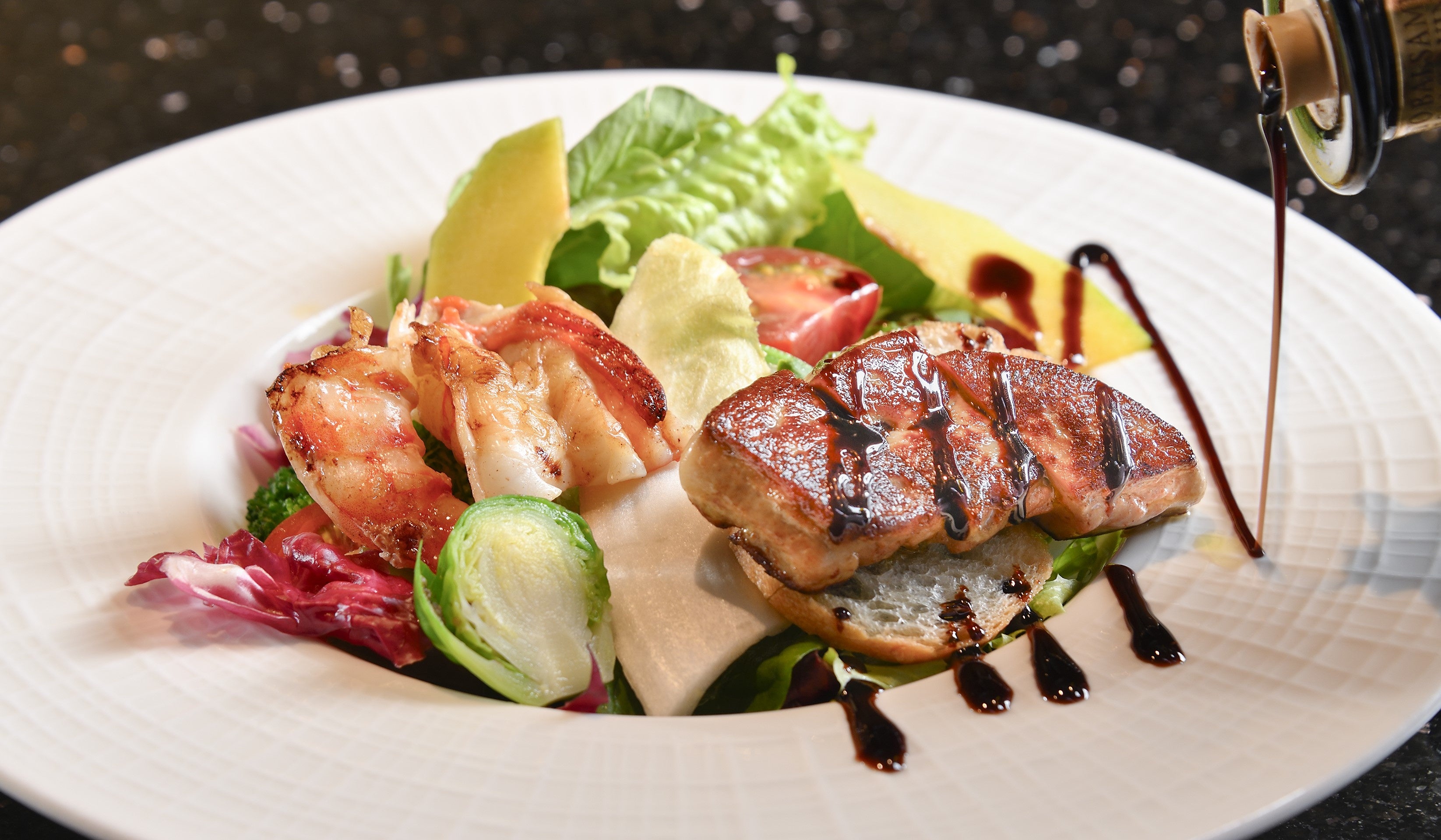 【メニュー】 「活車海老とフォワグラの鉄板焼 バルサミコサラダとともに」