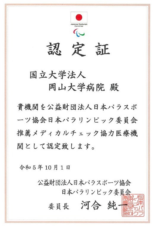 【岡山大学】岡山大学病院「パラアスリートヘルスケア外来」が日本パラスポーツ協会のメディカルチェック協力医療機関に認定