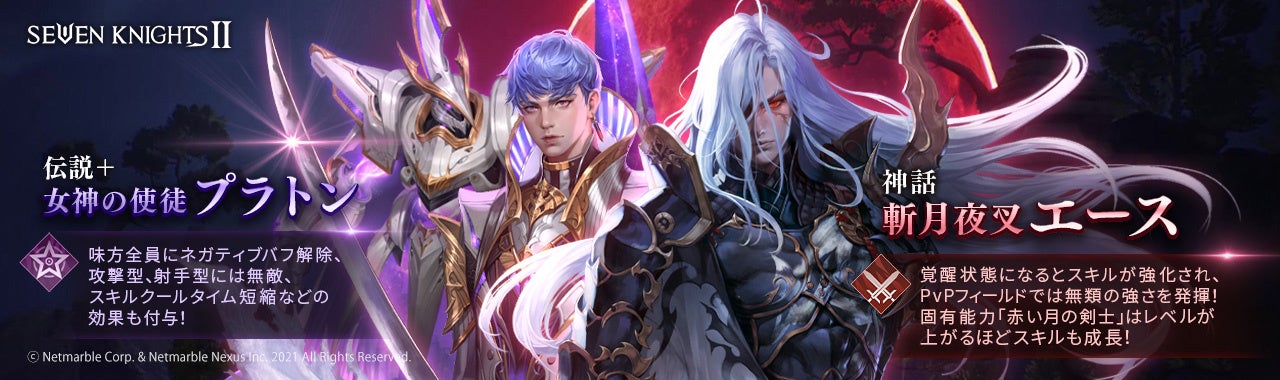 新規英雄の参戦を記念して、「斬月夜叉 エース」を必ず獲得できるステップアップ召喚の登場に加え、新英雄2人の成長段階に応じて「霊魂石」を獲得できる成長支援ミッションや、「女神の使徒 プラトン」の霊魂石をルビーで購入できるイベントを実施しております。