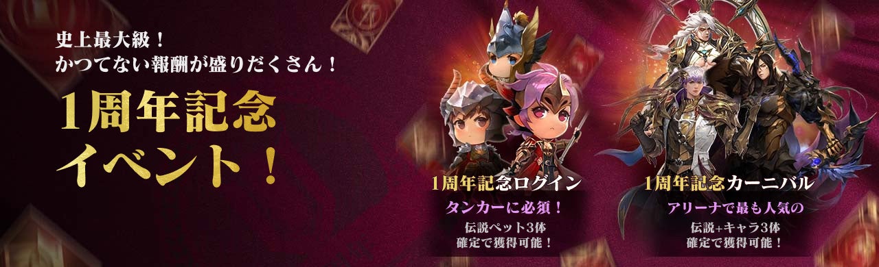 サービス1周年を記念して、高ランク英雄や新衣装、伝説装備など、豪華報酬を獲得できる様々なイベントを開催いたします。